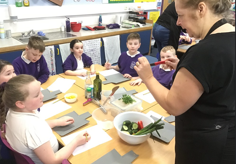 In preparation for our THRIVE Outside day at Mount Edgecombe next week, all year groups have taken part in a Food is Fun workshop, where Tami and her team have taught us how to prepare a variety of healthy 'snacks' or lunchtime treats. We go to apply our Y4 'spreading' skills when buttering bread and our Y3 'chopping' skills to dice and slice many different vegetables. 4 meal options were created: egg sandwiches, cheese sandwiches (with whatever 'extras' we wanted), rainbow couscous and a pasta salad. To top off a very interesting day, we invited in our parents to share the munching! You can see from their faces, how much they enjoyed benefitting from our culinary skills!